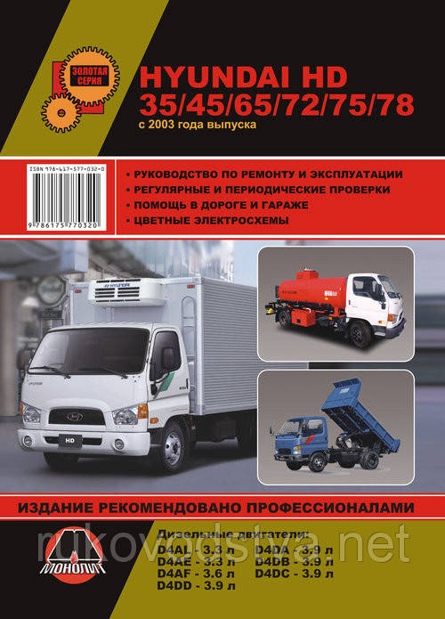 Посібник з експлуатації, ремонту та технічного обслуговування автомобілів Hyundai HD 35/45/65/72/75/78 з 2003 року випуску з дизельними двигунами.